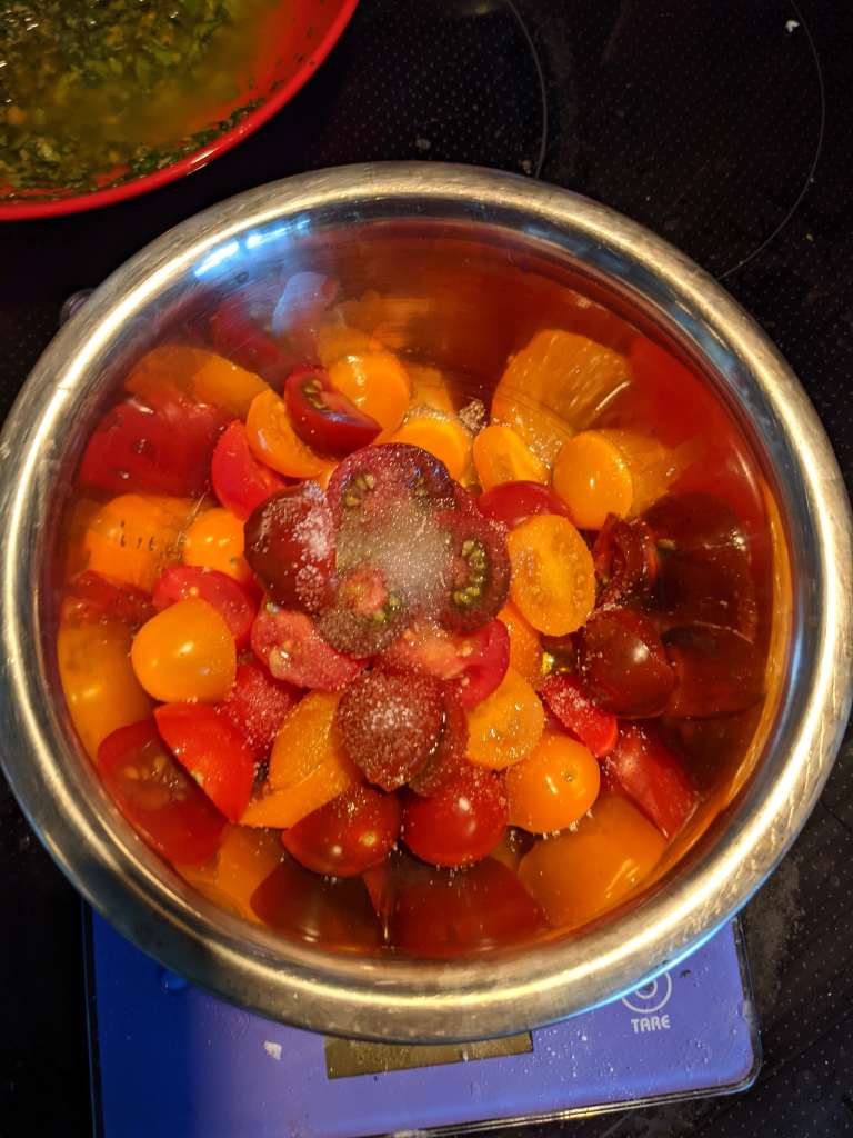 On a clean chopping board, roughly chop your 250g tomato creating all different shapes and sizes with lots of nooks for the salsa verde to creep into. Put in a medium bowl with 1tsp red wine vinegar, 1tsp olive oil, 1/2 sugar and a pinch of salt.