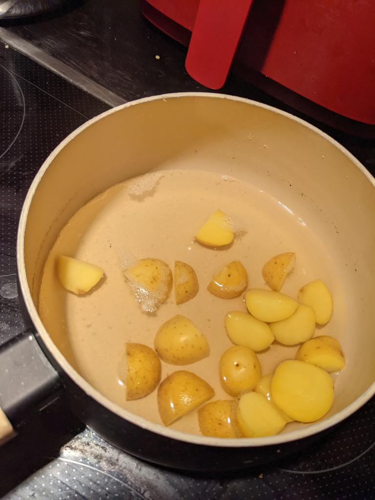 Next, cut up your potatoes into bite-sized chunks and boil them in salted water until they are tender.