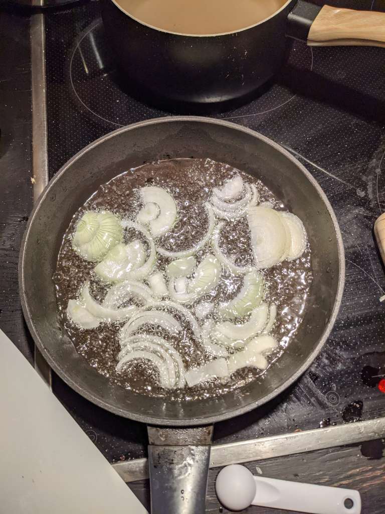 Slice up your onion, trying not to cry at their half moon beauty. These will need the longest in the oil to get crispy, so while you’re waiting the remainder of your jackfruit marination and potato boiling time get them in the oil until crispy – roughly 15 minutes.