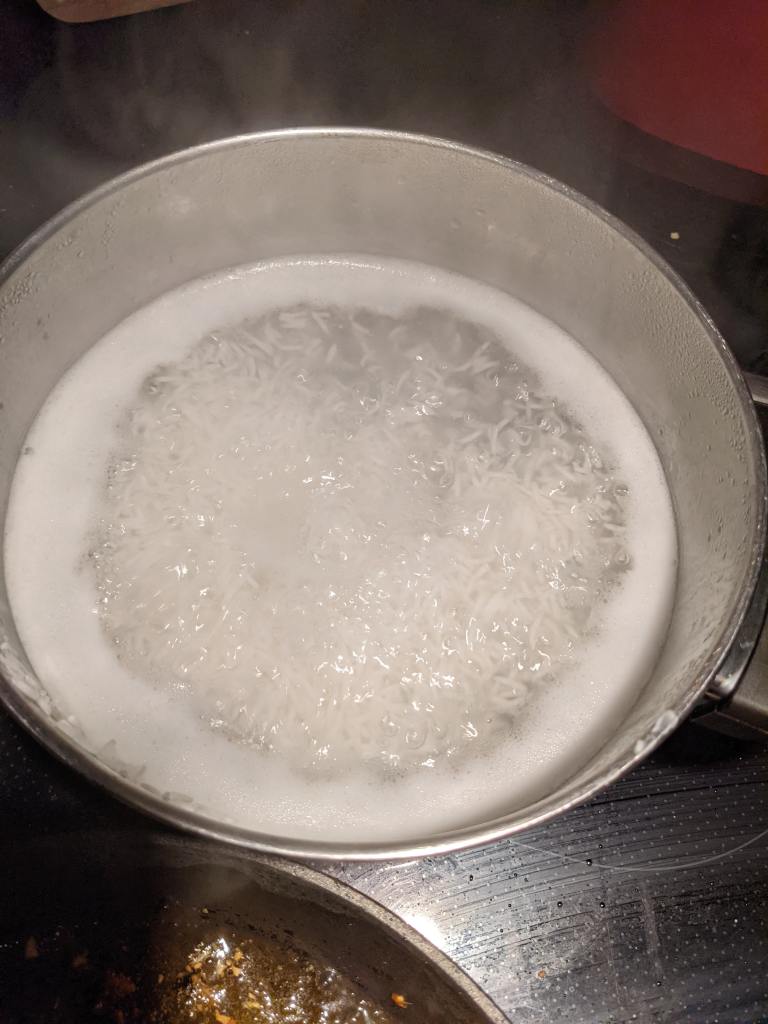 While you’re frying your biryani base ingredients, boil up some water to cook your rice. Drain the water it is currently sitting in, and bring a litre of water to the boil adding in 1tsp salt