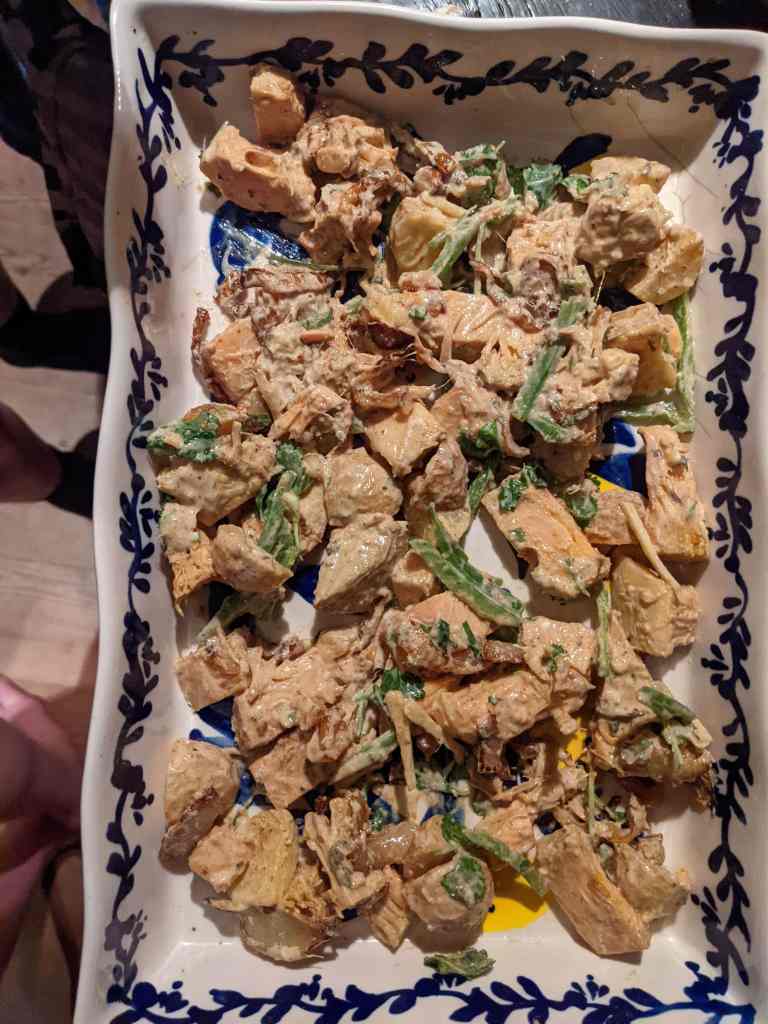 Once they’re crispy, put them to the side and repeat the frying with the potatoes and then the jackfruit. Look at you, Jack(fruit) of all trades!