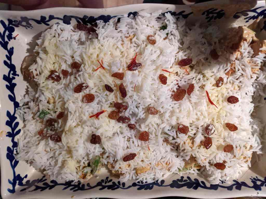 Drain the rice, not draining too thoroughly because some moisture will help to cook the rice, and spread evenly over your jackfruity biryani base. Then scatter the raisins on top so it looks like old Jack(fruit) frost has been to visit your biryani garden! Either that, or a rabbit..