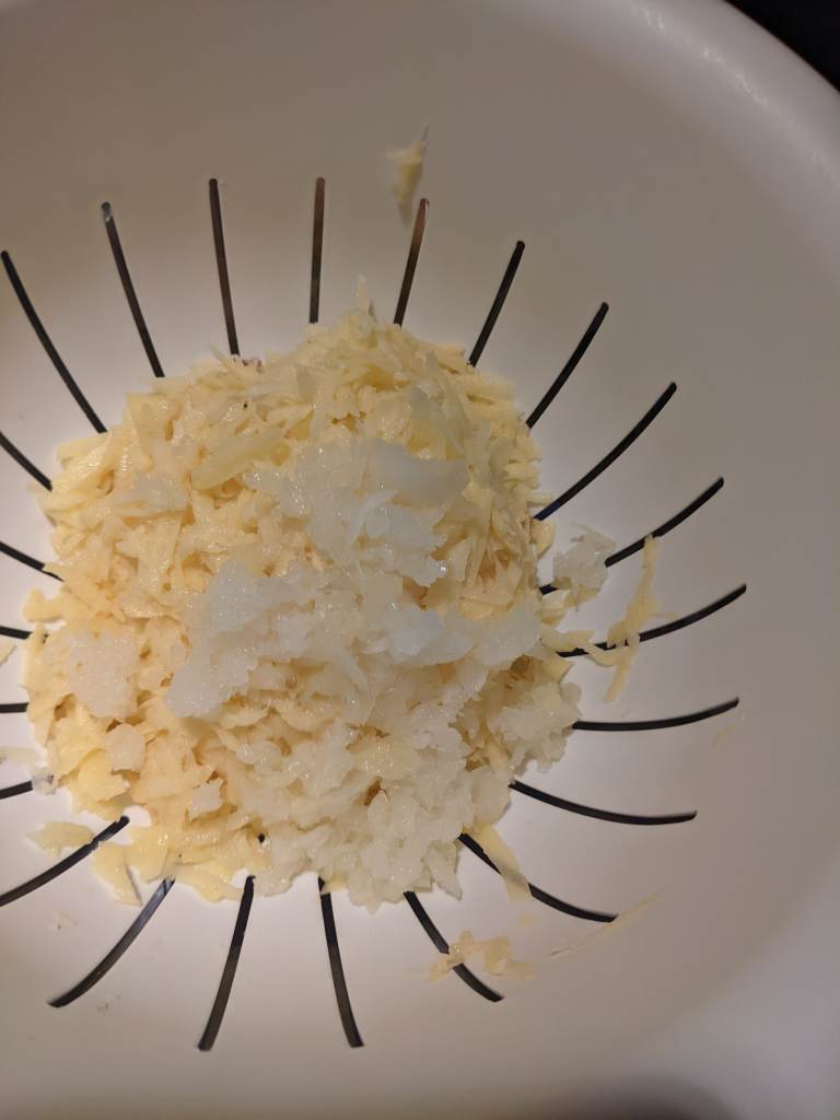 Strip your onion too, and grate it like the potato. Add to the colander and get your hands in there and give it a good squeeze until the mixture is dry. Leave them in the colander to drain for a couple of minutes.