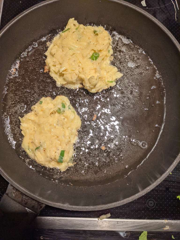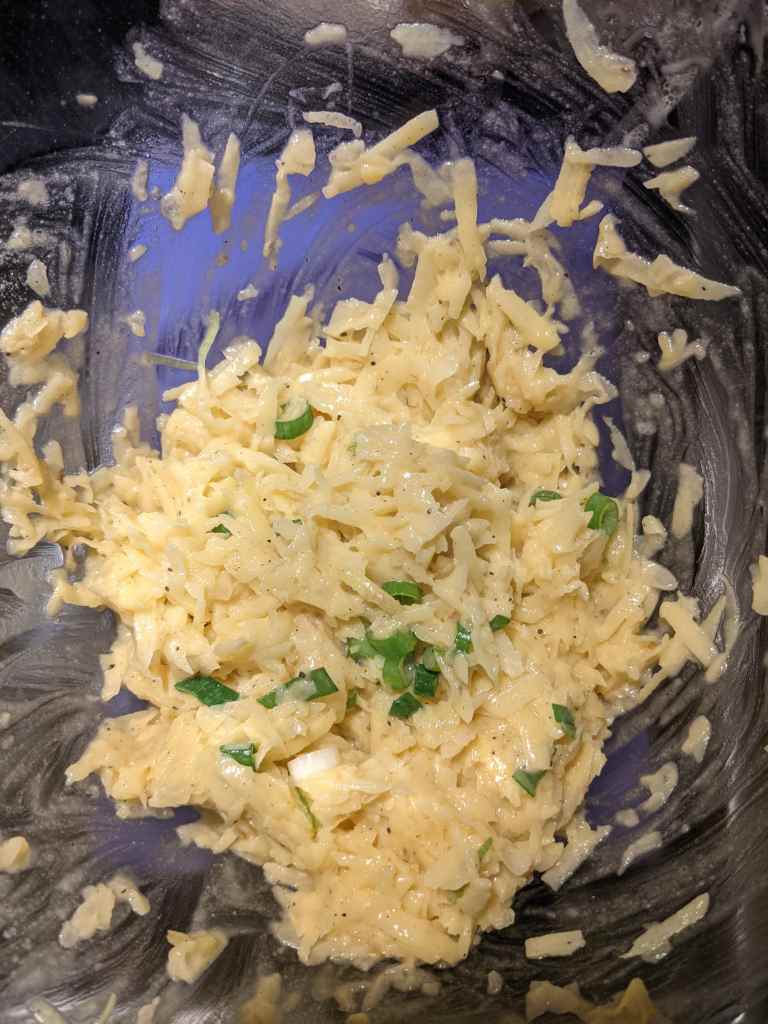 Pour off the pool of liquid underneath, don’t be tempted to take a dip, it won’t be pleasant. They’re should be some starchy liquid left at the bottom, add the potatoes and onions to this along with 1 egg, 2 spring onions finely sliced, 2tbsp plain flour, 1 1/2 tbsp butter, 1tsp salt and a dash of pepper. Mix it all together.