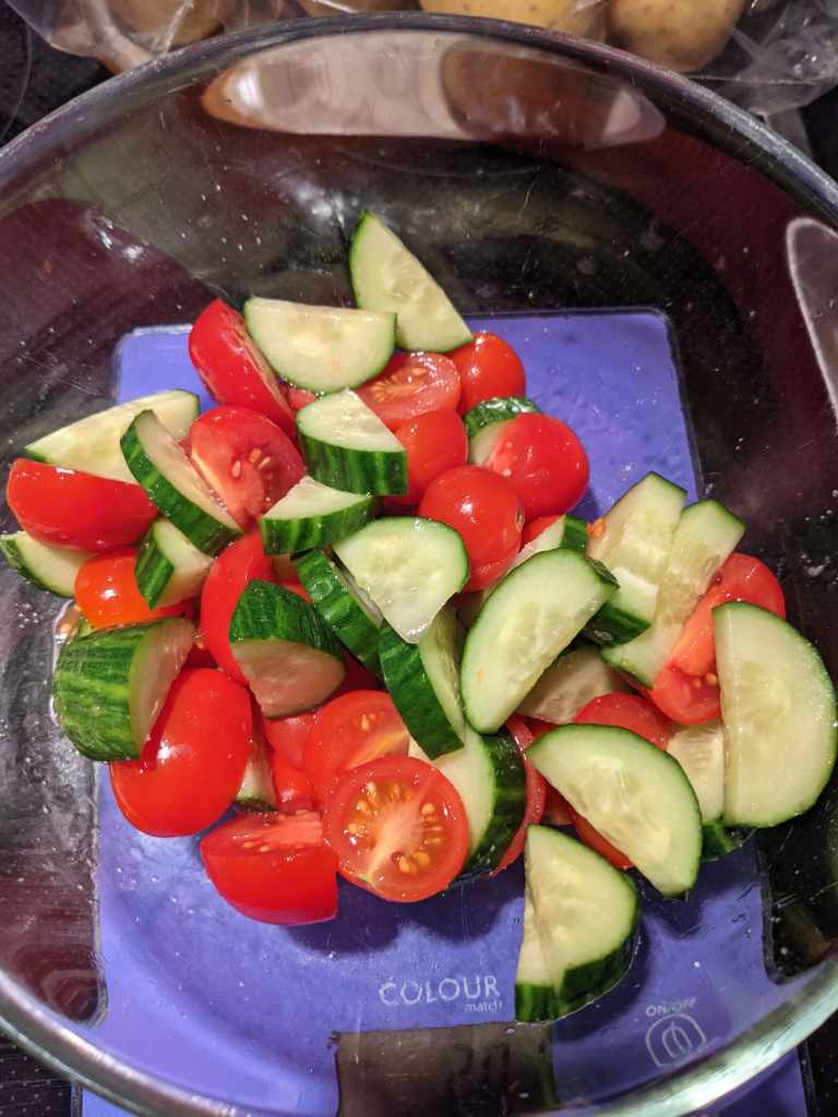 Whilst your oven is getting toasty, find yourself a large bowl and add your sliced cucumber and tomatoes. Salt bae sprinkle over a half a tsp salt and consider whether this salad should be gold encrusted (it shouldn’t, it is already a precious jewel in its own right). Leave the mixture to the side for 30 minutes.