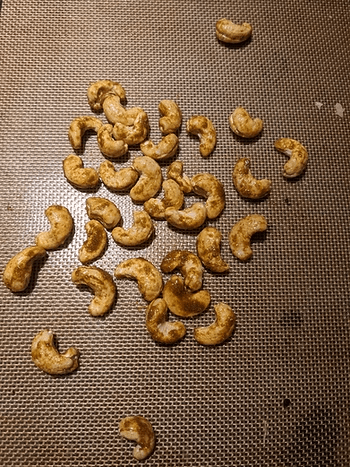 Now find yourself a much smaller bowl and mix together 1/2tsp olive oil and 1tsp curry powder, a 1/4tsp salt then add 50g cashew nuts and toss.