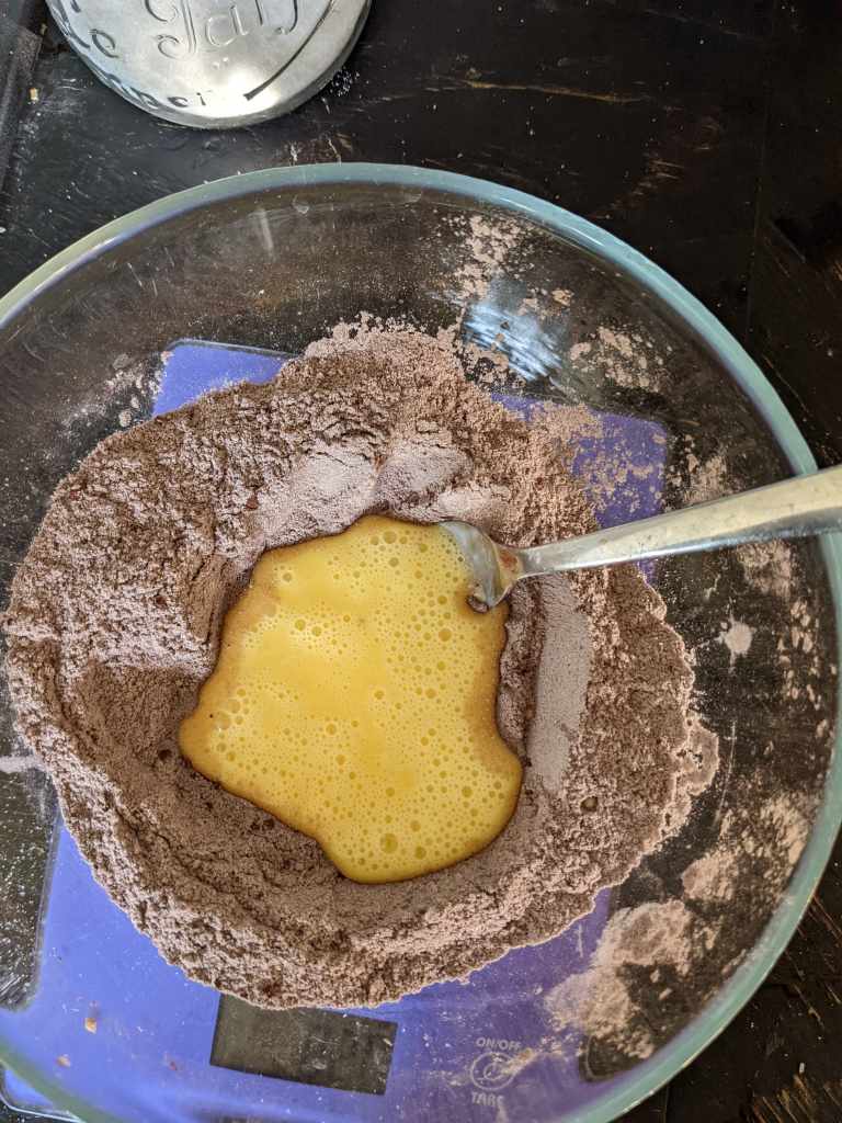Well, well, well – make a well in the centre of the dry mixture. Pour in the extravagant egg mix and mix with the dry ingredients using a fork.