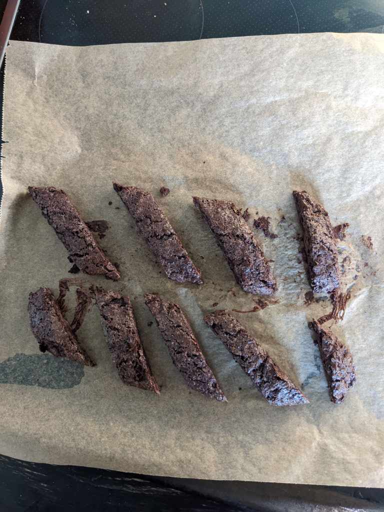 After 25 minutes, remove your glorified chocolate log from the oven. Turn the oven down to 130c. Get those cantucci looking authentic, maybe they’ll be DOP? Chop the chocolate log in diagonals at 1cm intervals and then bake the biscotti for another 25 minutes. Remove from the oven and set aside to cool.