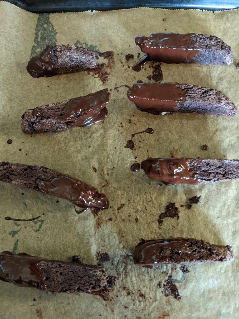 Heat 50g of dark chocolate in the microwave or in a ban marie until it is melted. Dip half of each cantucci in and set aside to cool. A sprinkle of salt on the chocolate end doesn’t go amiss!