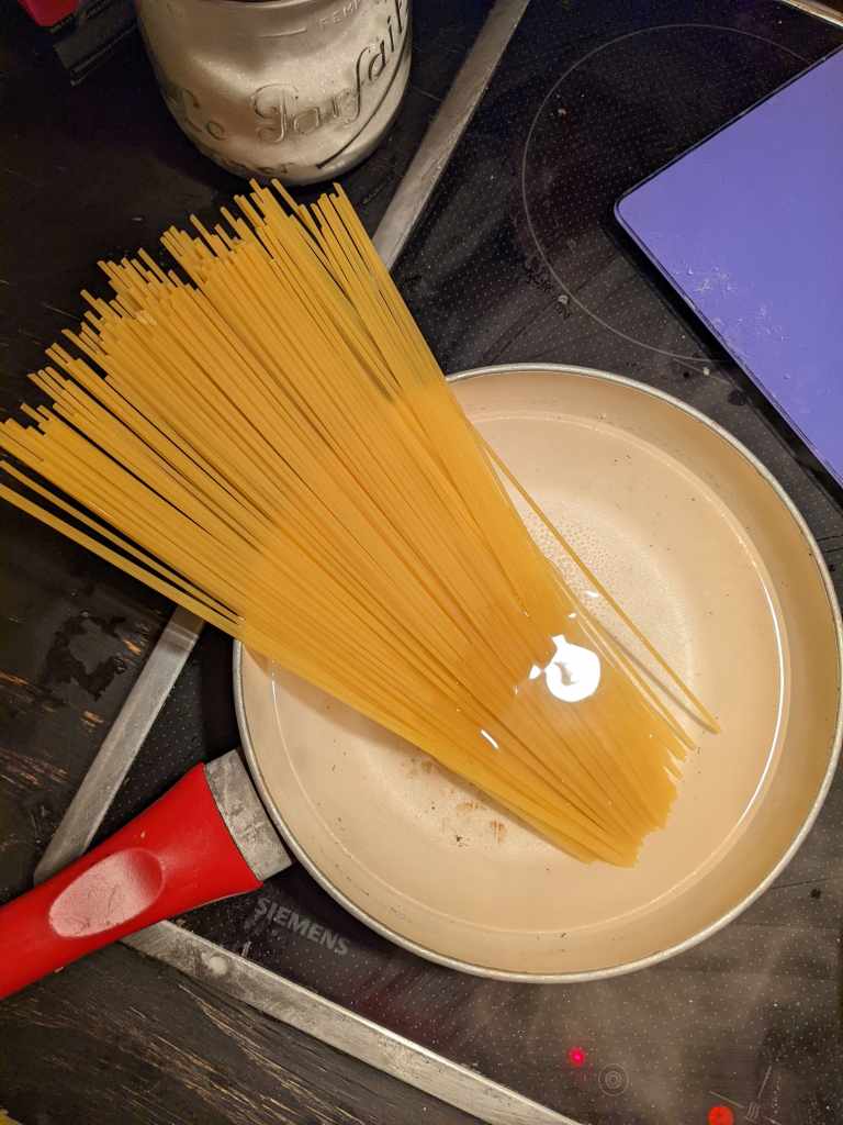This recipe is cooked quicker than you can say la dolce vita, so boil a big pot of water with a few generous pinches of salt (the water should taste like sea water) and add 220g spaghetti.