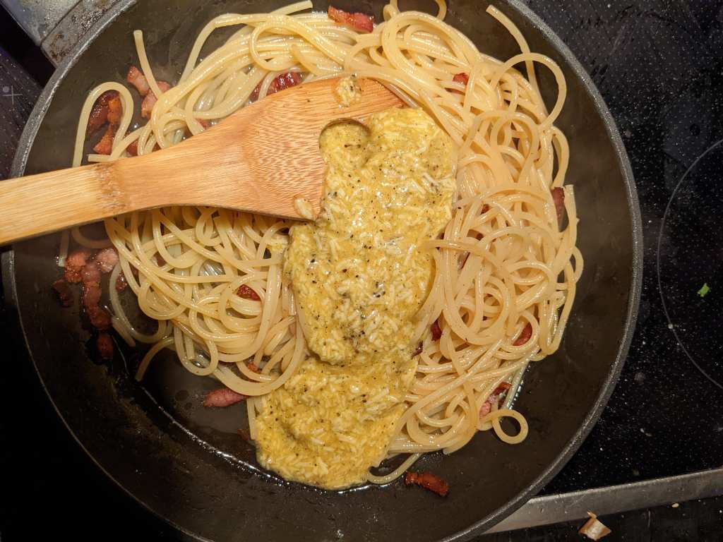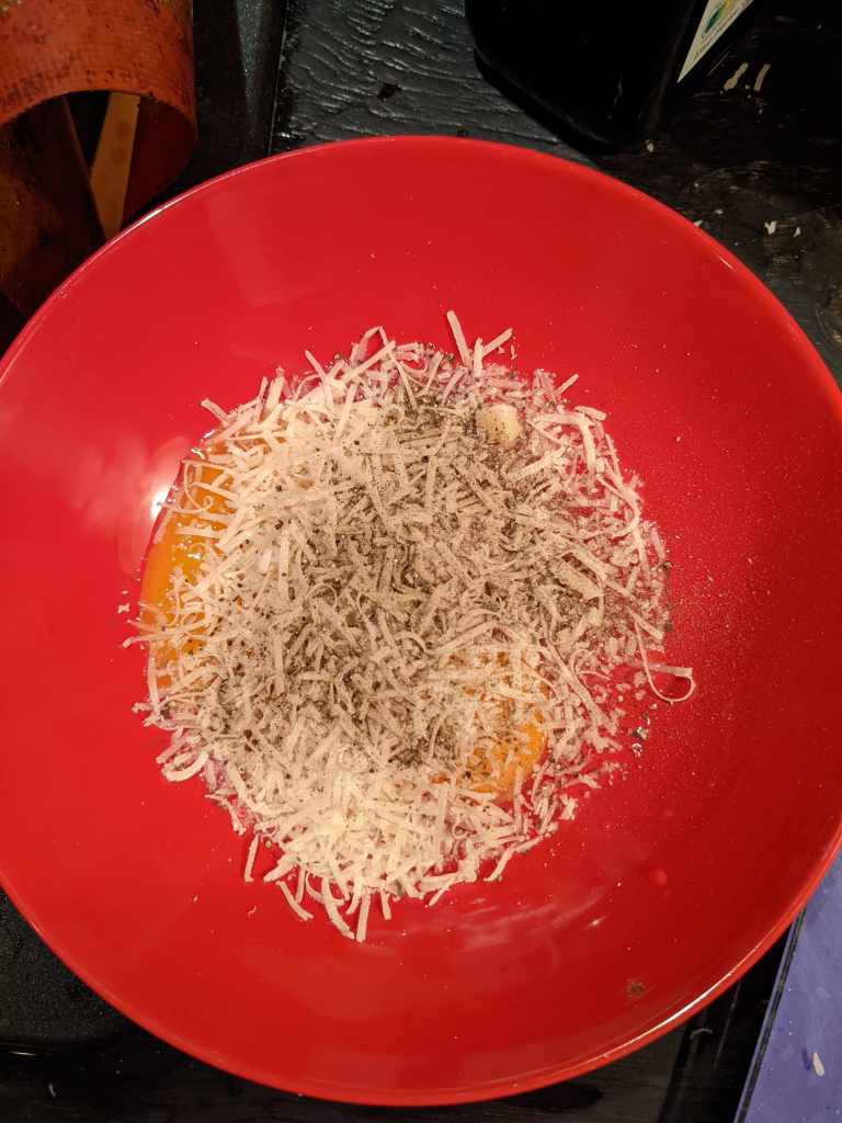 While this cooks in the pan, get cracking (literally) on the egg mix. Break two eggs in a bowl, and add a couple of egg yolks if you’re feeling indulgent! Grate in 50g parmigiano reggiano to the egg. Add a generous dash of pepper and stir together.