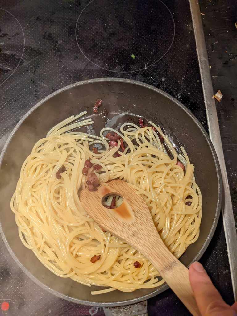 Once the pasta is done, with a little bit of bite, drain it, reserving some of the pasta water for later if it’s needed. Your pork should also be ready, if you want to make this healthier, well turn back and make a salad, or dab some of the fat out of the pan with a tissue. Turn the heat off and pour in the spaghetti.