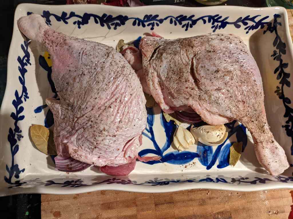 Prick the duck legs and season with salt and pepper, rub in while remarking how much like an old wrinkly person the duck looks. If you’ve got some trivet ingredients (e.g carrot,onion, celery,a bunch of herbs) roughly chop these and place in the bottom of a roasting dish. This will give the duck some more flavour and also give you some extra things to make a gravy if you so wish, or just have alongside as some delicious vegetables roasted in duck fat.