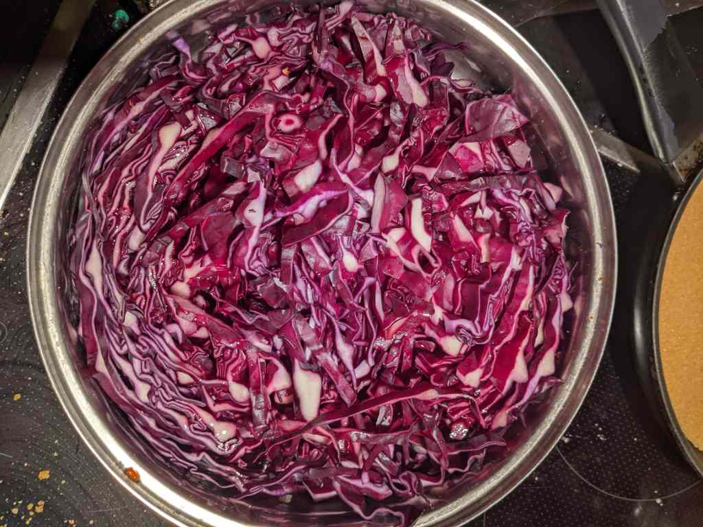 While the duck is in the oven, there is plenty time to prepare the red cabbage. Shred as finely as you can, marvelling at the cabbage’s marbelled beauty, and pop into a large saucepan with 100ml of vinegar. Simmer and stir occasionally for 30 minutes.