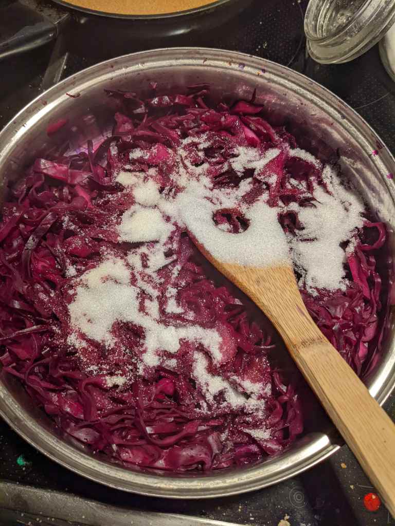 Once the 30 minutes of simmering are up, add in 75ml of chosen berry juice, 75g sugar,1/2 tsp salt. Stir it in and cook for as long as you like – the longer you cook it the softer it will be, but this comes down to preference!