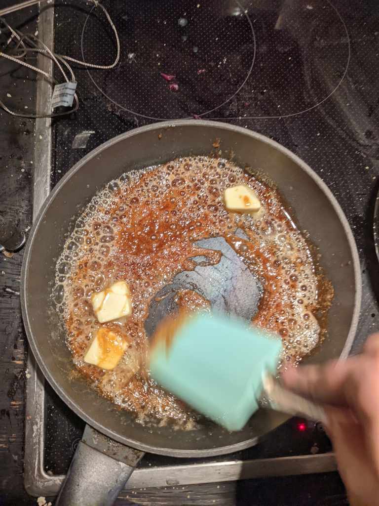 Begin by melting the sugar in a heavy bottomed saucepan. Once it is melted add in the butter and stir violently (as you can see from the below photo, violently is no exaggeration).