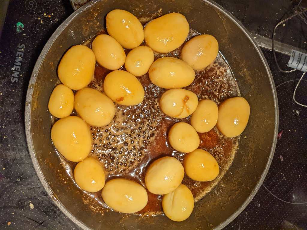 Add in a little splash of water to loosen it up, and your potatoes and stir to coat them in that lovely caramelly goodness! Season with salt and pepper.