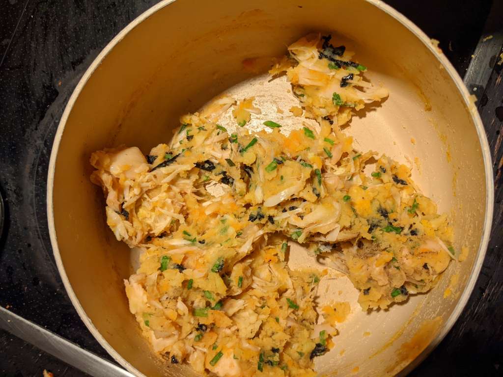 Pop your 565g drained jackfruit into a nutmilkbag or sieve and squeeze as much liquid out as you can. Mix all of the “fish”cake ingredients (mash potato, jackfruit, 1 tbsp miso paste, juice and zest of lemon,2 tbsp chives, one crumbled up sheet of nori) together to make a glorious fish-less base.