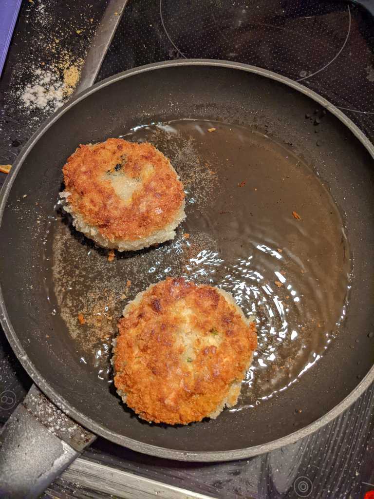 Time to fry these babies up. Heat some vegetable oil in a pan (enough for a shallow fry, we don’t want Mariana Trench depths thank YOU!) and carefully add the cakes until golden brown. Don’t crowd the pan.