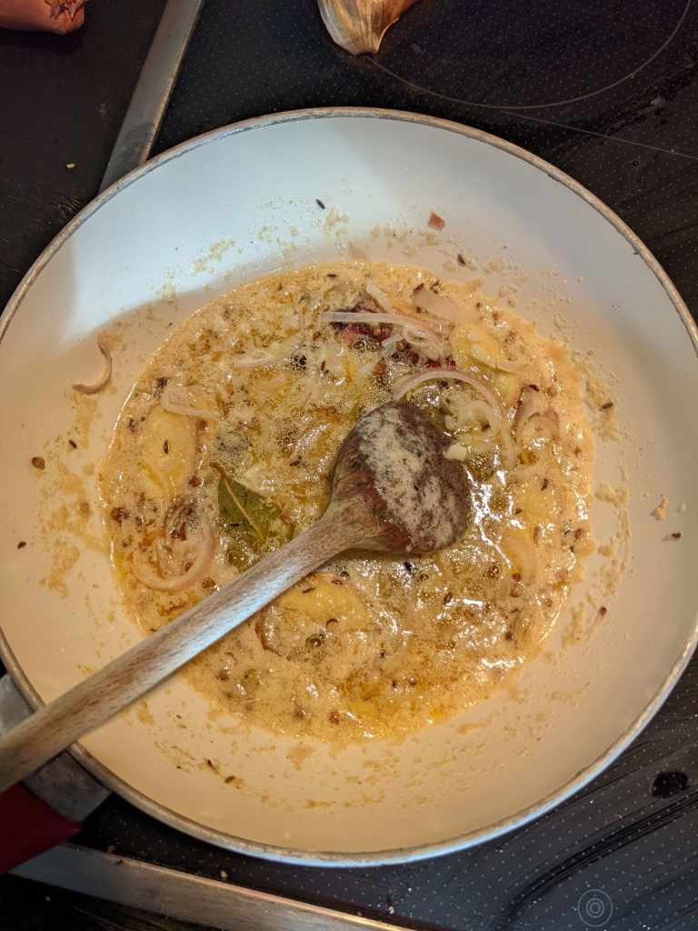When your veg is looking nice and minced, and them to a saucepan along with 125g butter, 1 small cinnamon stick, 2 black cardamom pods, 1/2 tsp cumin seeds, 1/2 tsp fenugreek seeds, 1/2 tsp coriander seeds, 1/2 tsp black peppercorns and1 small bay leaf.