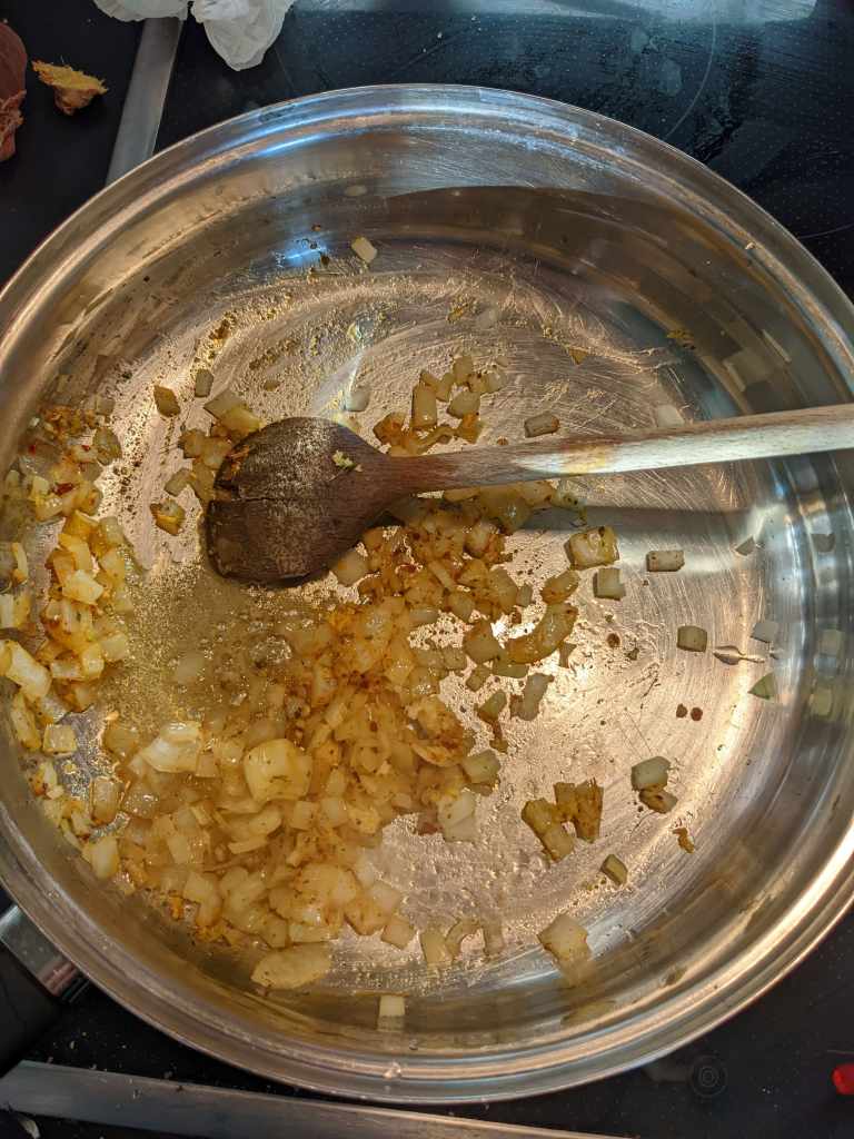 Once the niter is kibbehed, start on the filling. Dice one small onion and one garlic clove, and heat 1tbsp of niter kibbeh in a large pan. Once hot, add the onion and 1/2tbsp berbere. Next, add the minced garlic clove and 1/2 tsp of ginger paste for one minute.