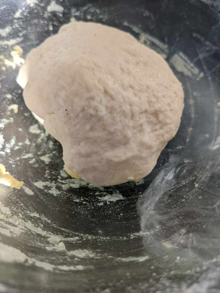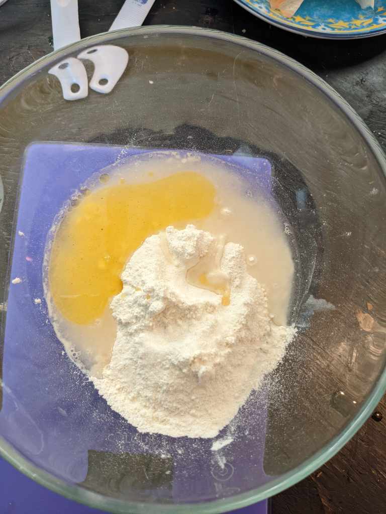 While the lentils simmer, make the dough. Tip everything: 125g plain flour and 1/2tsp salt and 50ml of water along with 1tbsp of niter kibbeh into a large bowl.