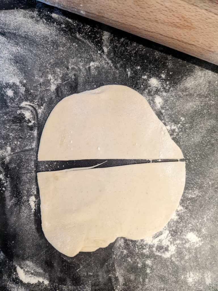 Roll one bowl into a 2mm thick circle and then cut in half. Add 1tsp of filling slap bang in the centre of each semi circle