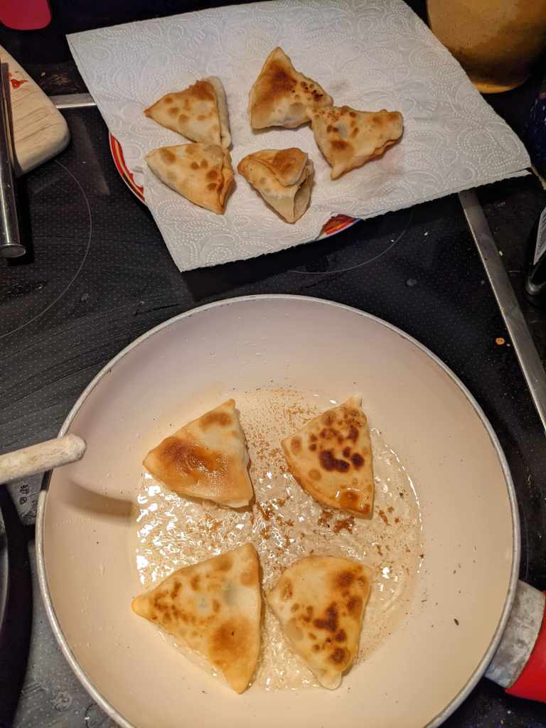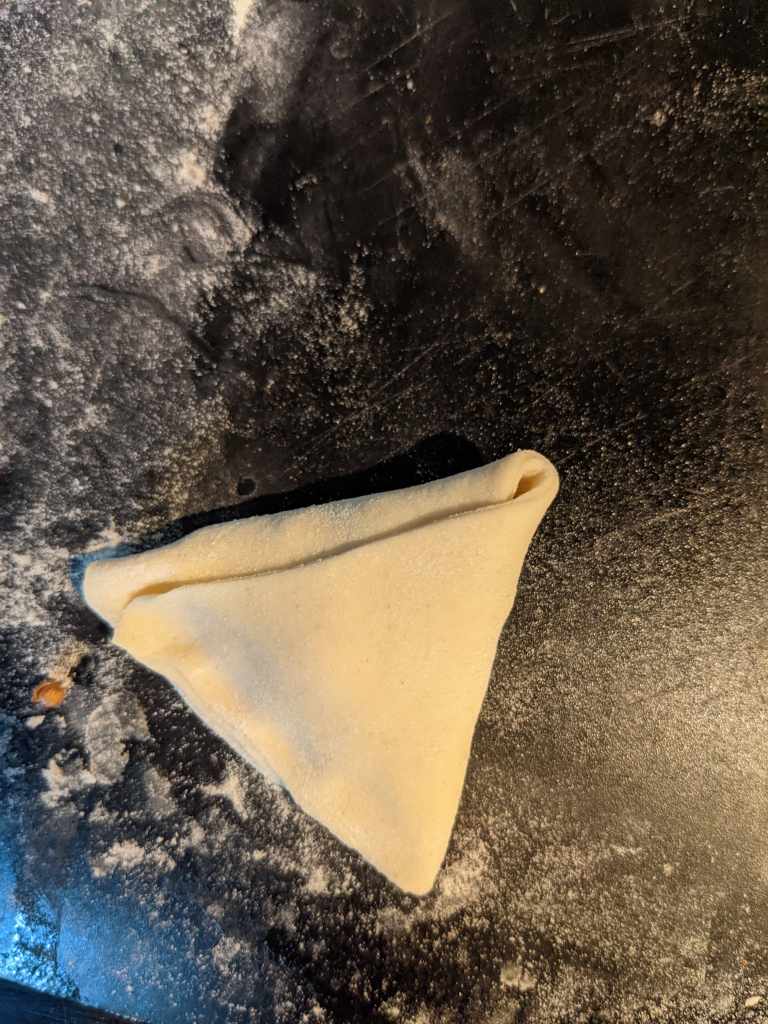 To create the iconic sambusa triangle: bring the bottom part of pastry up and over the filling and then fold the top corner down to create a triangle that would make any ancient Egyptian quiver with jealousy. Pinch the edges of the dough together, using water to stick the dough down if necessary.