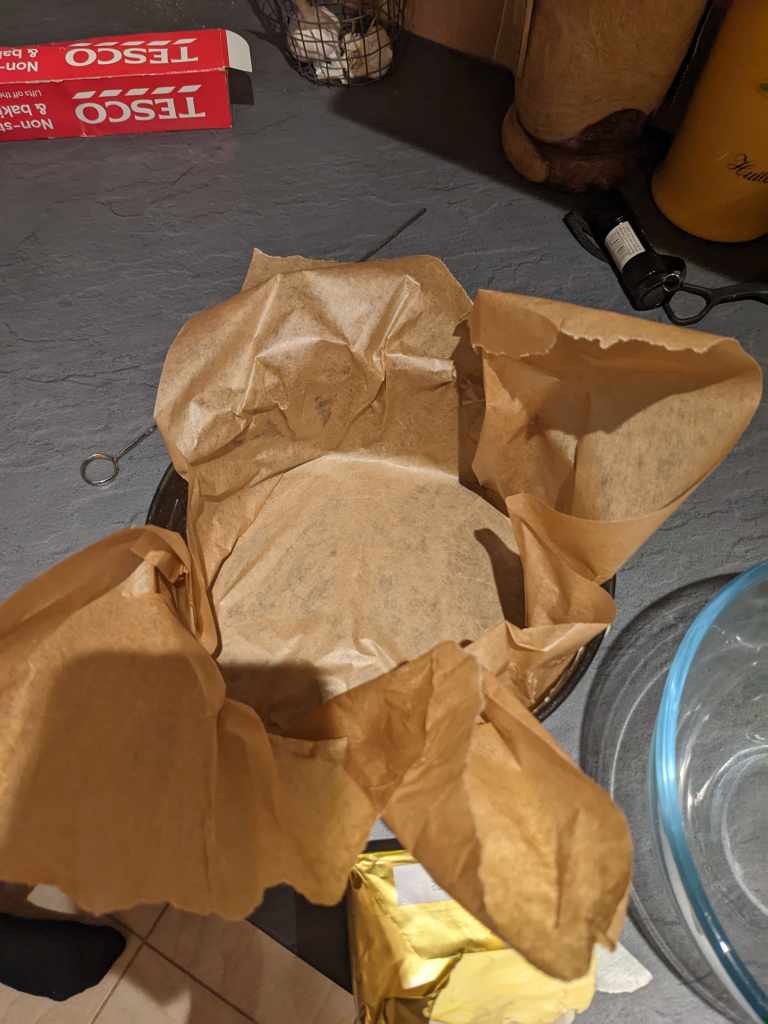 Pour the mix into your pre-prepared parchment paper tin.