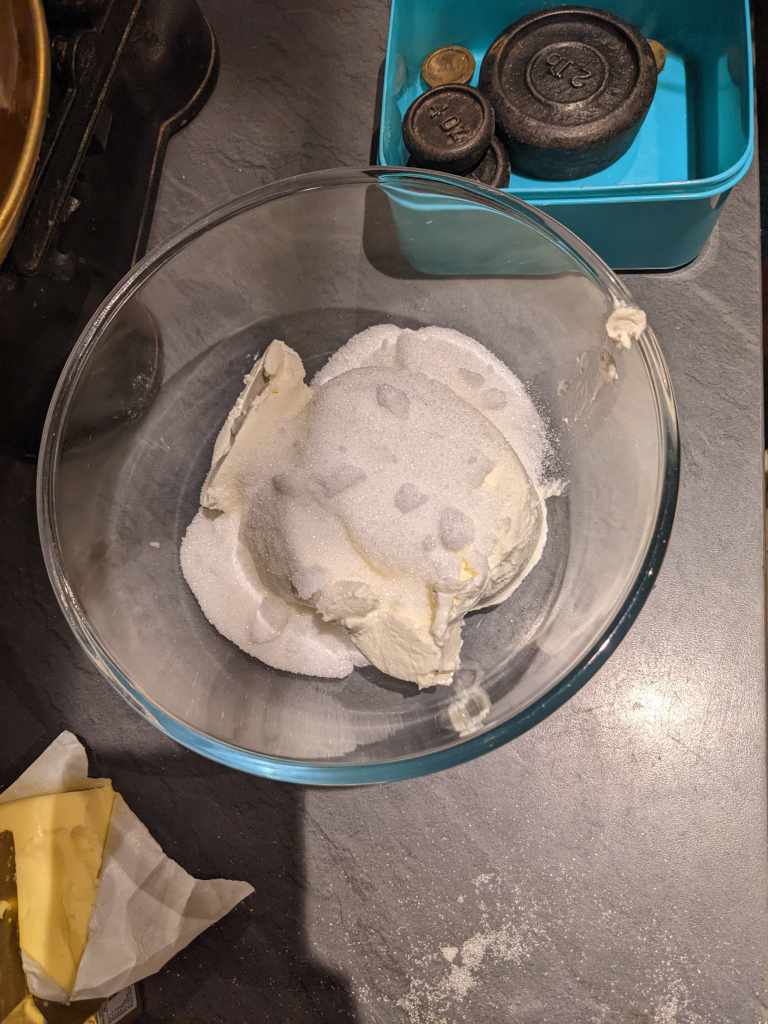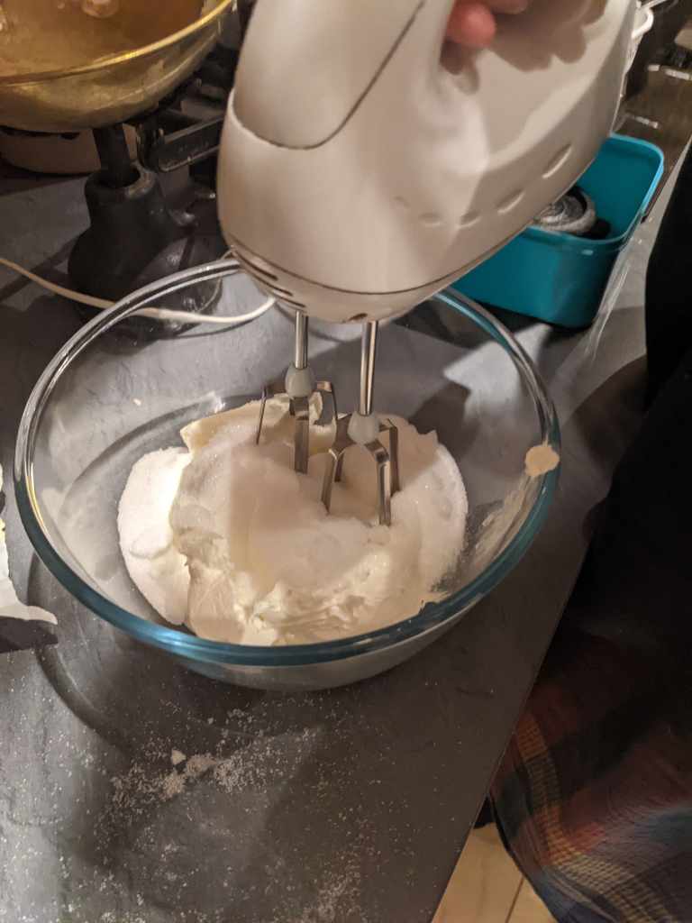 Mix together 450g cream cheese and 250g sugar with an electric whisk on a lowish speed, you don’t want to redecorate your kitchen today! Beat until the sugar is combined, a couple of minutes, and there are no lumps. Don’t forget to scrape those sides down and mix all the mix.