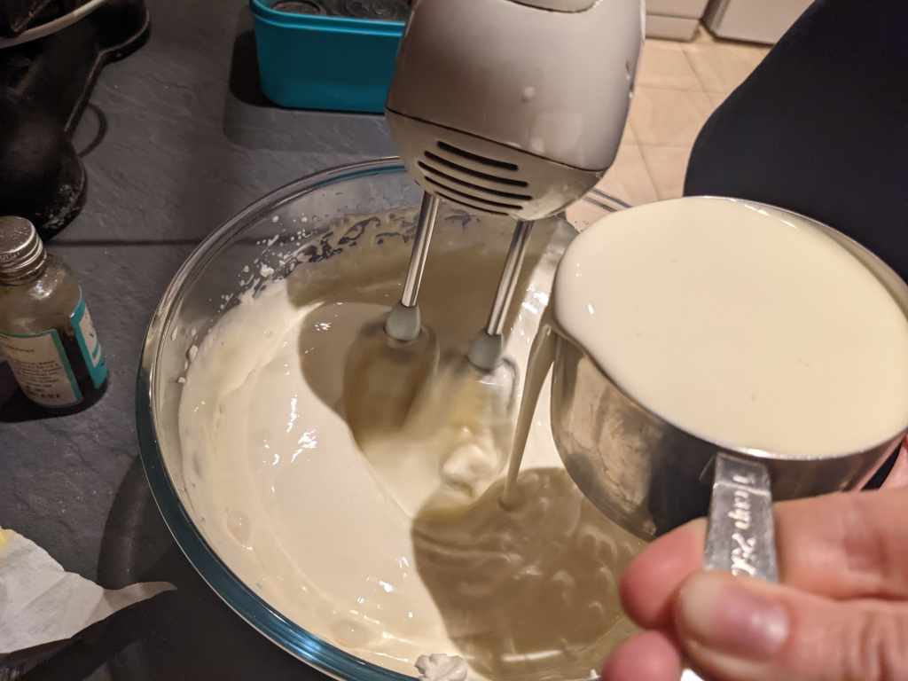 Up the anti on your whisking and stick it on medium, add an egg and mix for 15 seconds – repeat with the next two eggs.