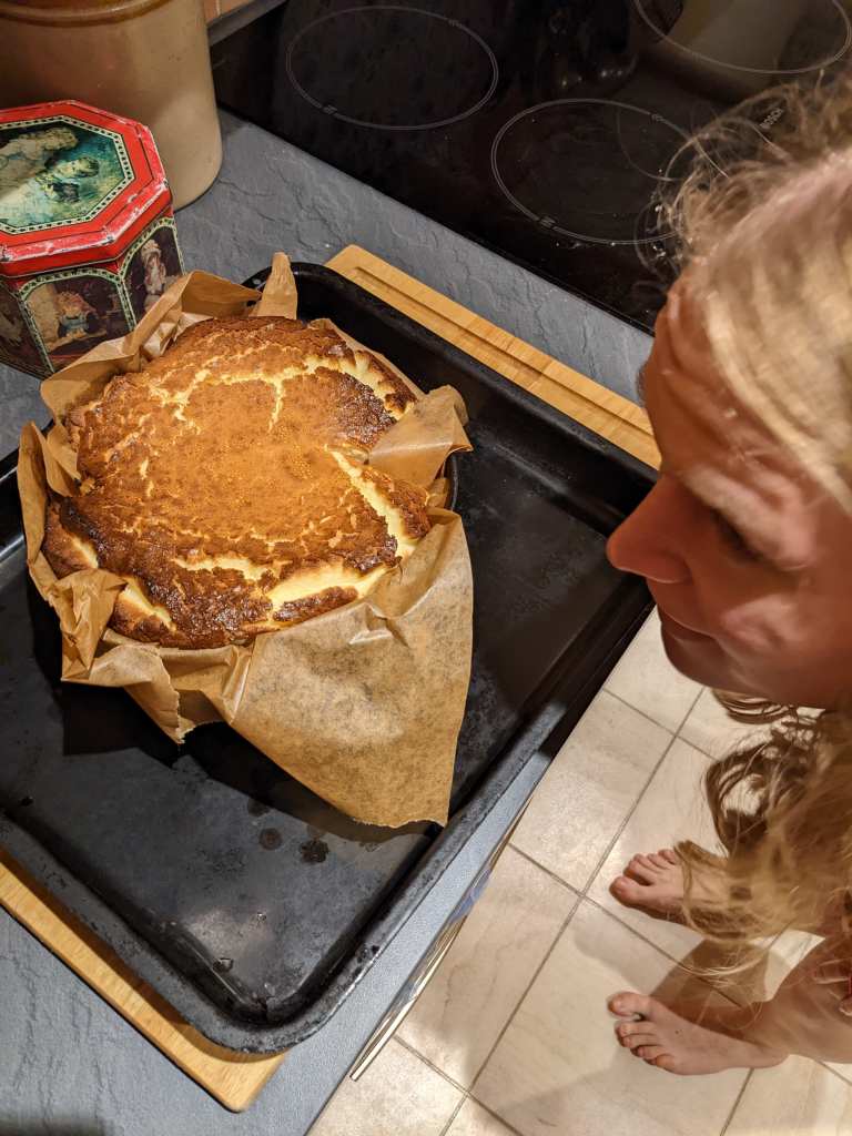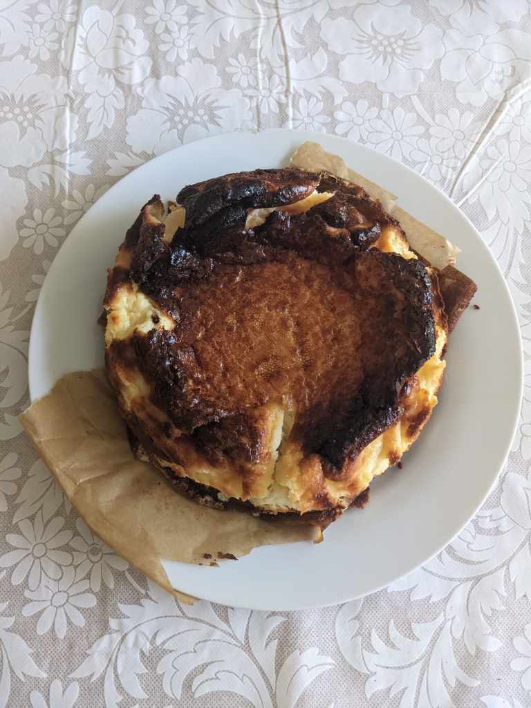 Bake for 60 minutes in your already toasty hot oven. It should be a deep golden brown, like someone who has spent too much time in the sun on the Basque coast, and still jiggly in the centre, like someone who has eaten too much lovely Basque food.