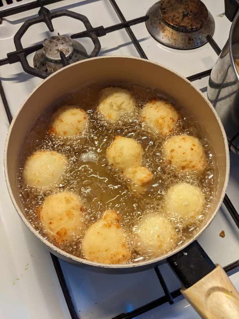 Get yours hands back in the mix and form a small ball in your hands. Drop the boil into the oil carefully, so it doesn’t splatter and create a Jackson Pollock like disaster. Keep adding balls until there is no more space in the pot. These tend to roll and flip on there own, but you might need to keep them moving with a gentle nudge.