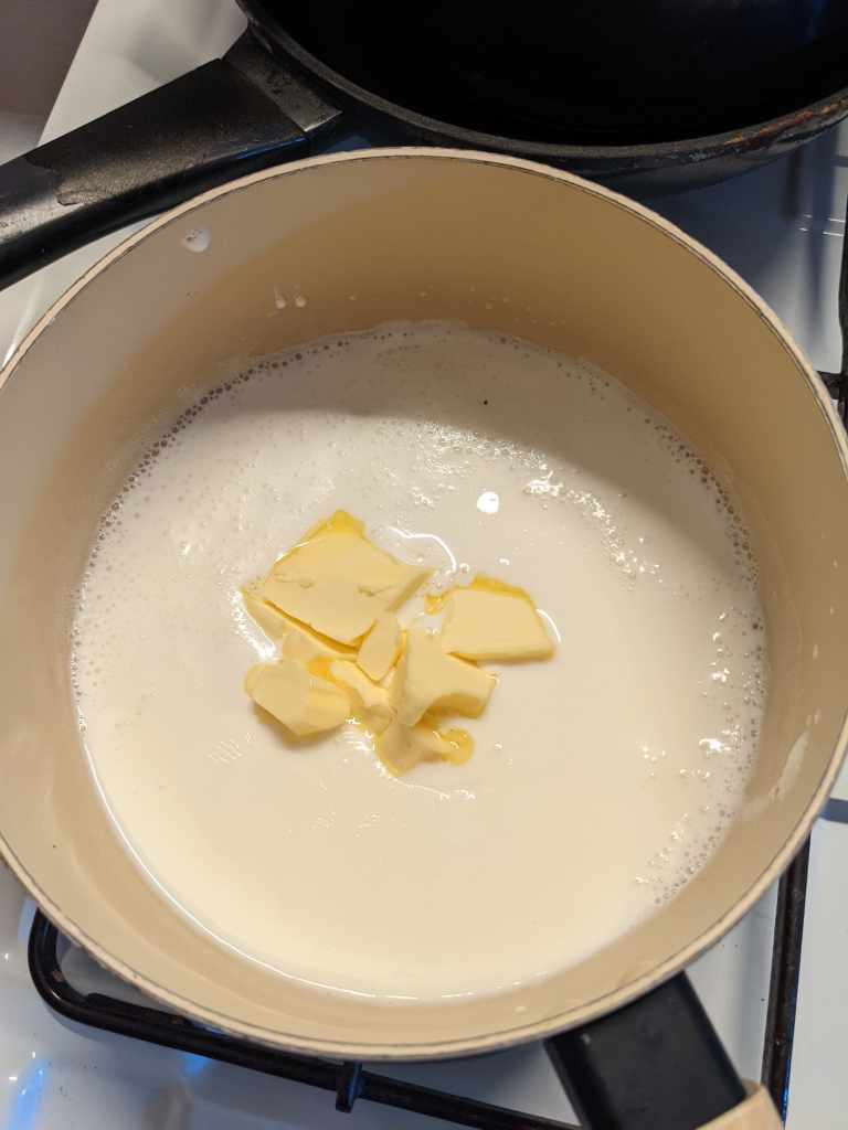 Heat your 300ml milk and 50g of butter gently in a pan or microwavé, not too hot, find your inner Goldilocks eating porridge and make sure it’s just right aka. hand temperature . If it’s too hot leave it to cool a little.