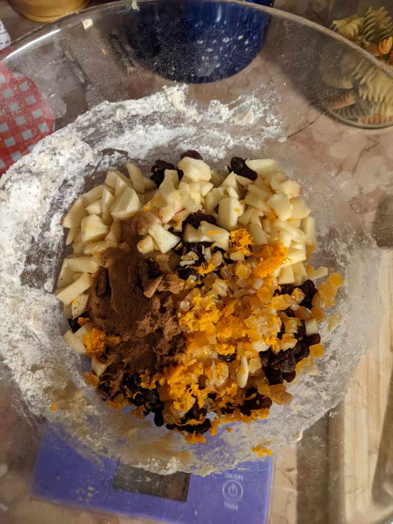While the dough is rising, prepare your ‘filling’ ingredients. Weigh out 150g raisins, 80g mixed peel and 2tsp cinnamon, core peel and dice 1 apple and zest 2 oranges