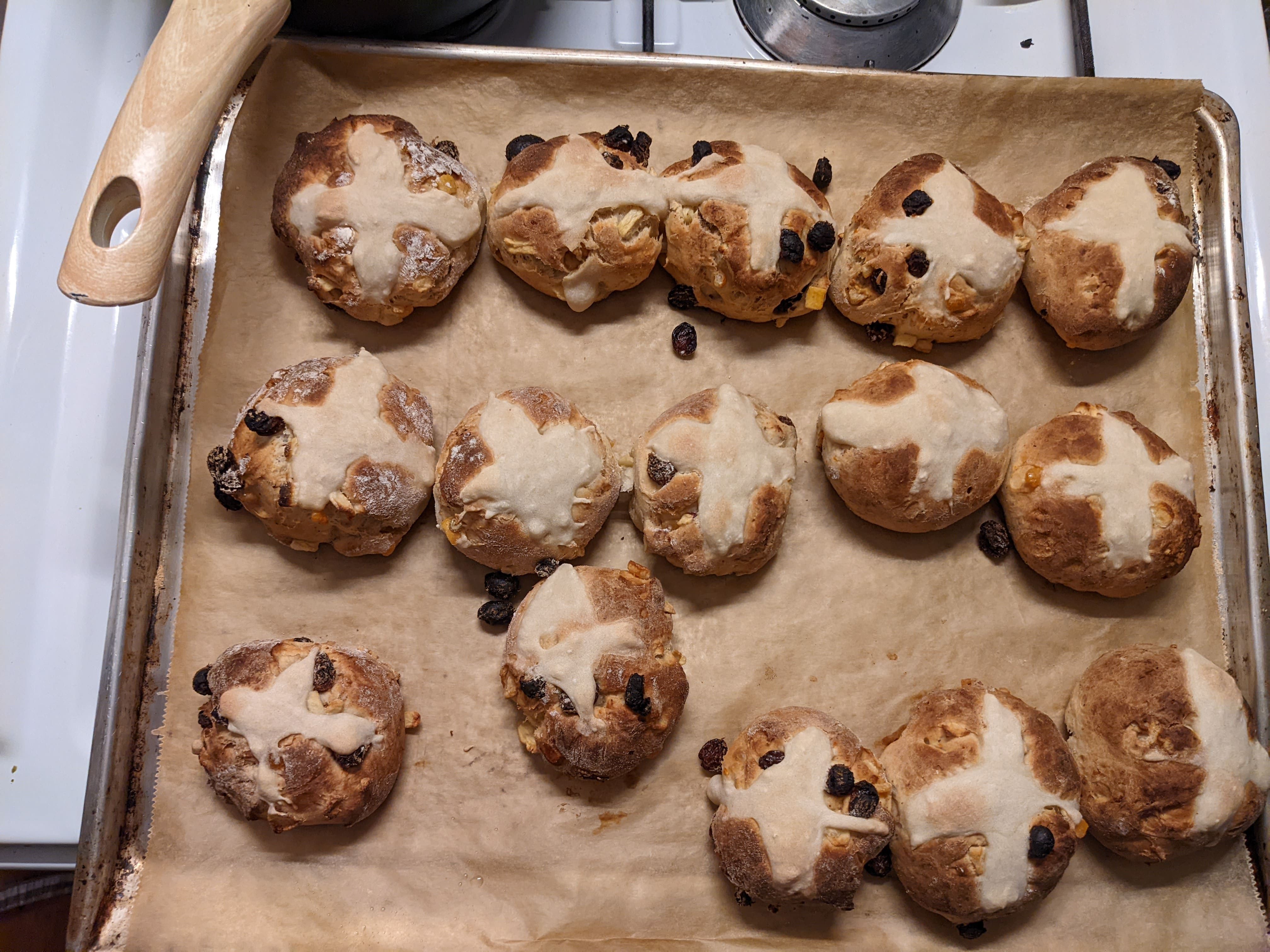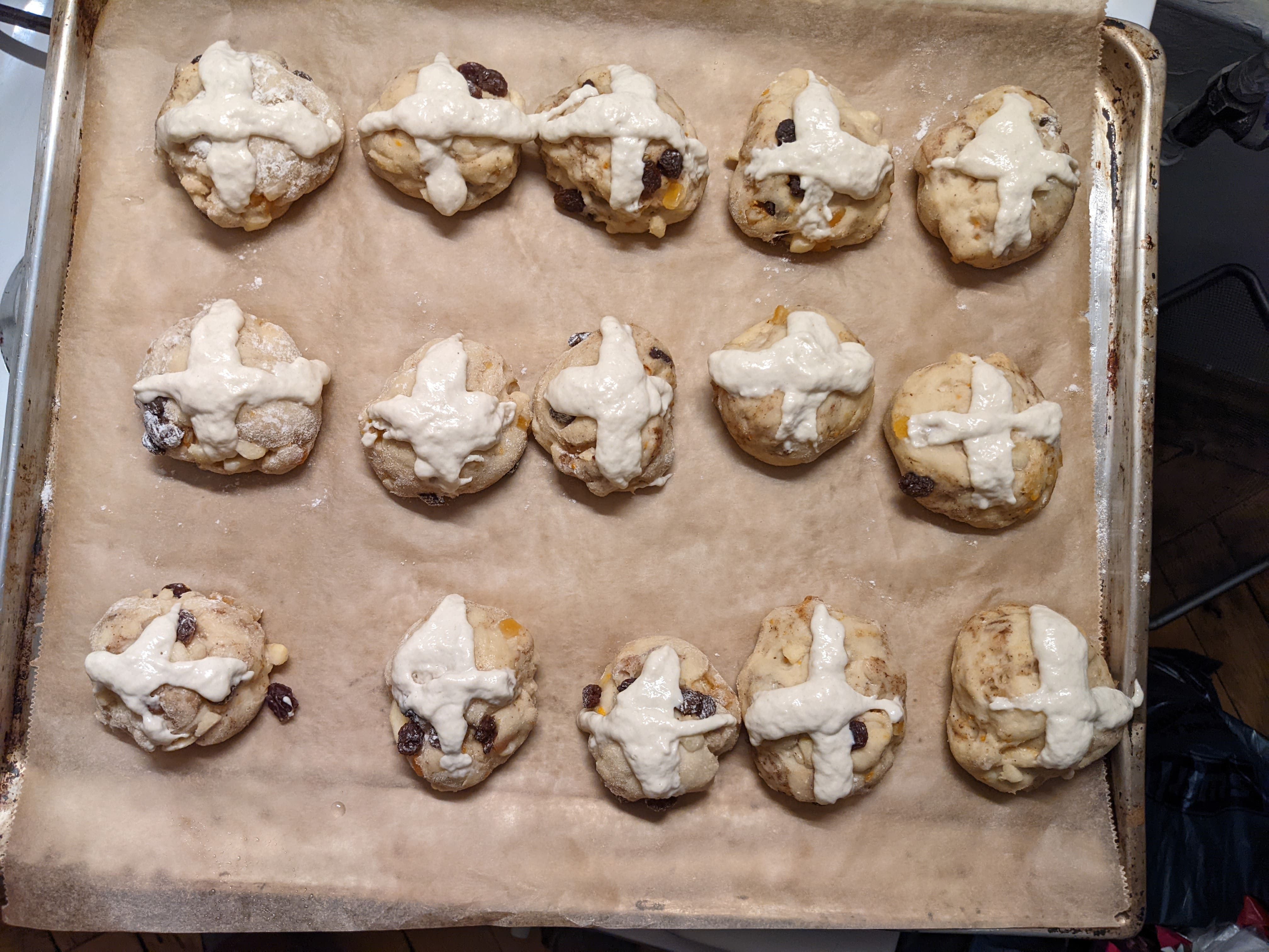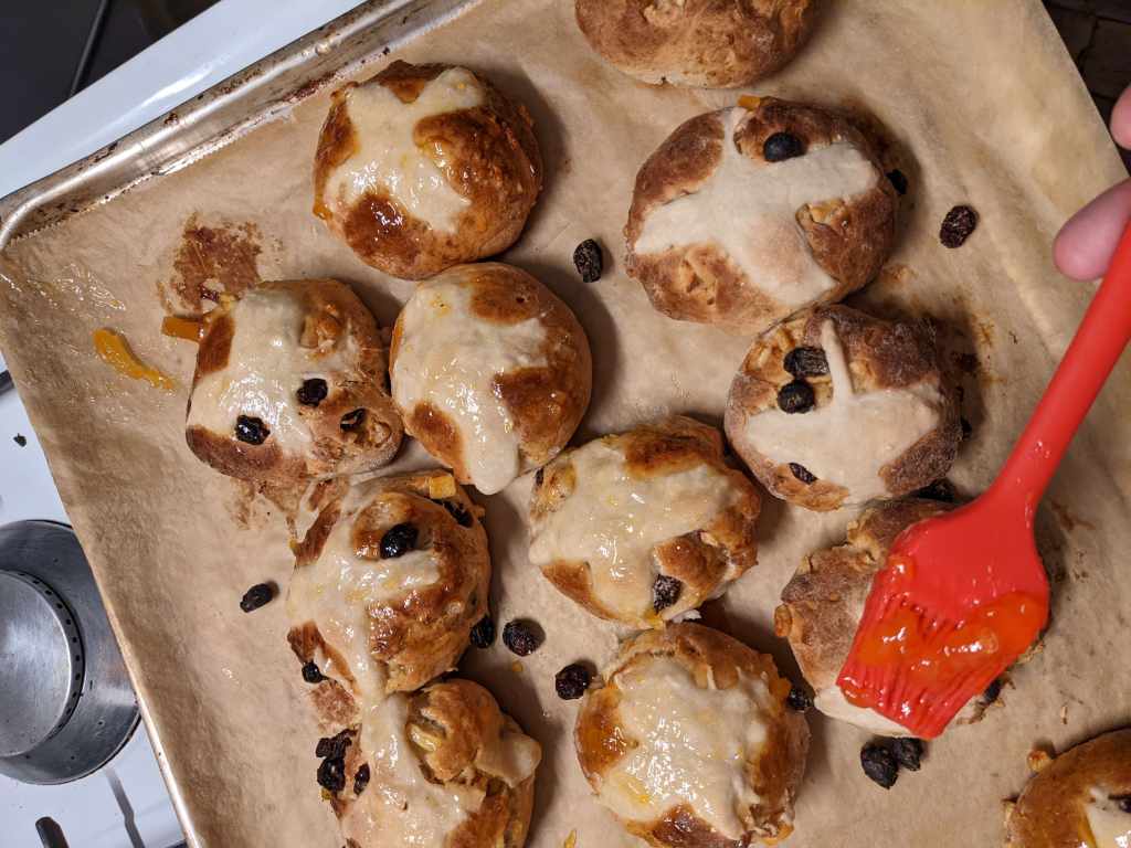 Add this paste to a piping bag (or freezer bag with the corner cut off if you still refuse to buy adult kitchen supplies like us) and pipe crosses on top of the buns. Don’t worry if they come out a bit Jackson pollock, as long as there’s a rough cross shape you’re good.