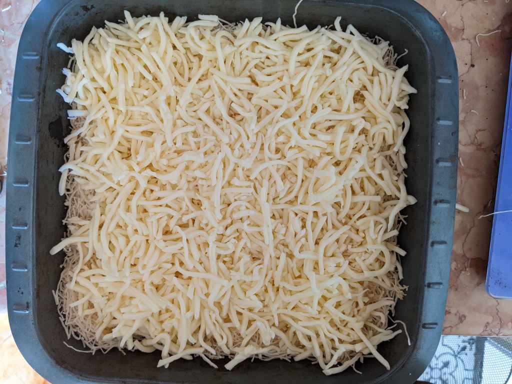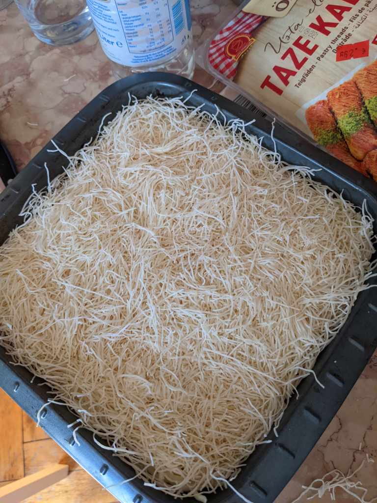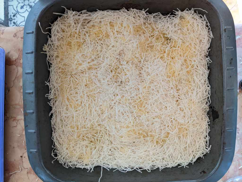 Finish this off by adding the rest of your kadayif dough overtop and sprinkling with the rest of the butter. Push down once again with your hands.