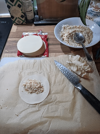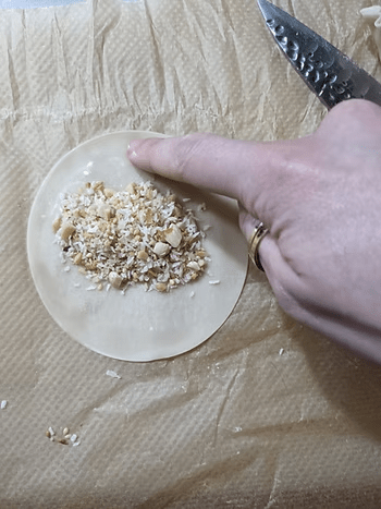 Drag a wet finger over the edge of half the dumpling wrapper. Add 1tbsp of the nutty filling.