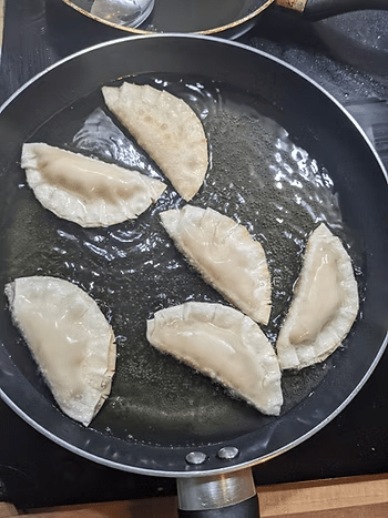 Add enough nuetral oil to a saucepan so that the dumplings can float in it, like a sensory deprivation tank for food. Heat it to a medium hot heat. You will know it’s hot enough when a chopstick bubbles lightly when it is stuck into the oil.