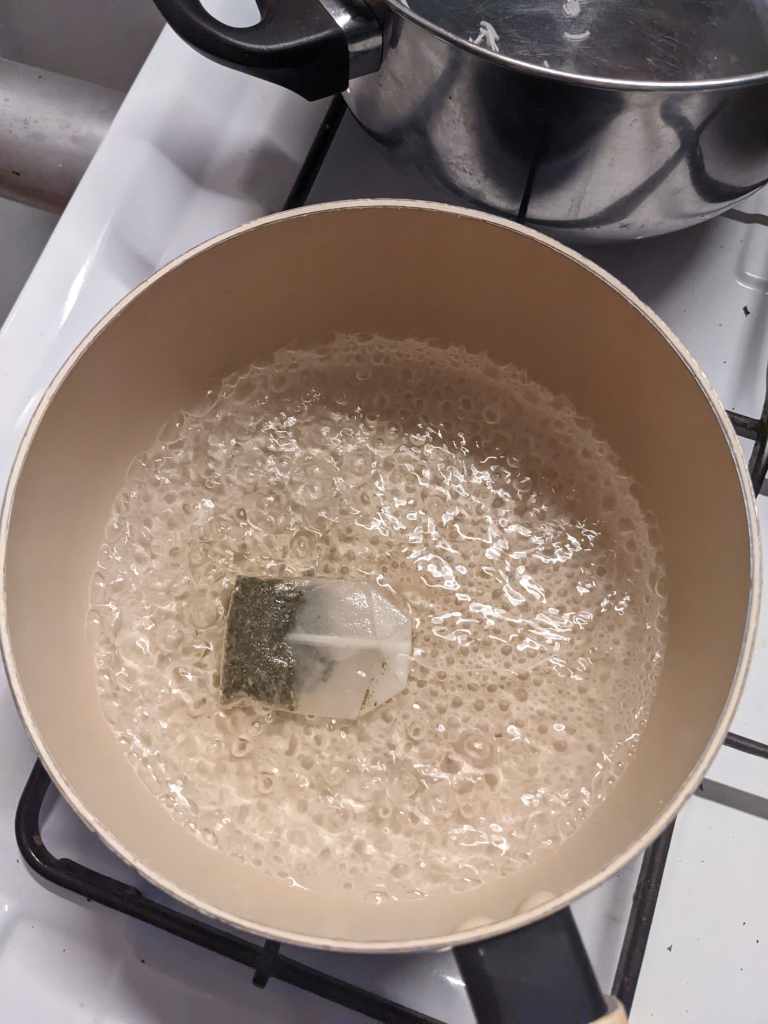 Start by boiling 600ml of water in a saucepan with lid. Add in 2tsp green tea leaves (or a green tea tea bag if you aren’t a fancy influencer bish with loose leaf) and a pinch of bicarbonate of soda top get this party fizzing over.