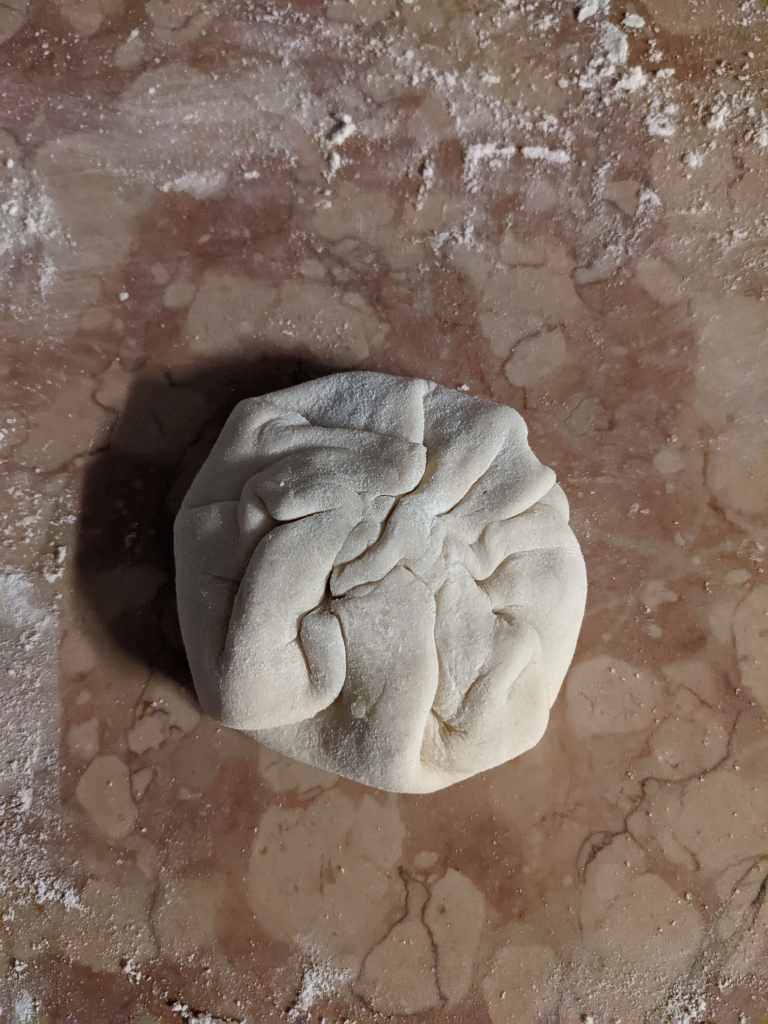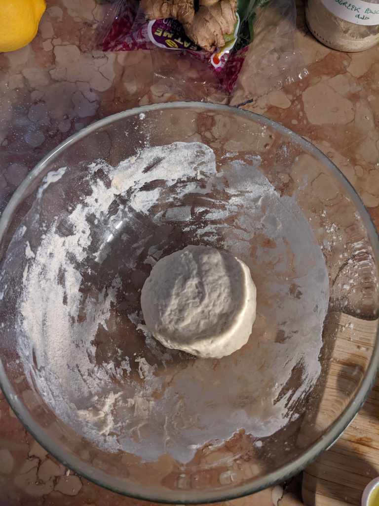 Pour the dough onto your work surface and knead for a few minutes, until it bounces back when poked (we are all envious of that resilience). Then put the dough back in the bowl and cover with a tea towel or plate so that it doesn’t dry out.