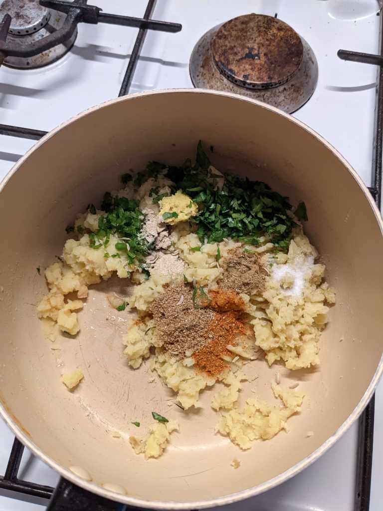 Add 1/2tsp ginger, 1/2 a chopped green chilli, 1tbsp fresh coriander, a pinch of salt, 1/4tsp chilli powder, 1/2tsp garam masala, 1/2tsp coriander powder, 1/2tsp of fenugreek (crush these before adding if you are using) and a squeeze of lemon. Taste test the mash and add more salt etc. as you see fit.