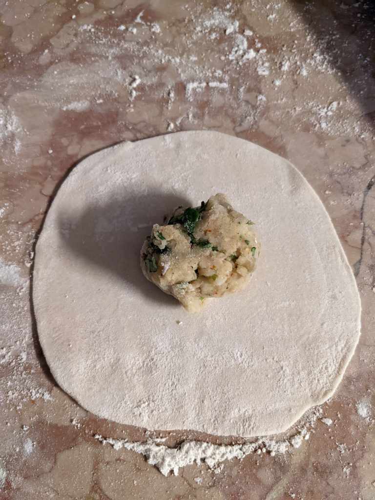 Grab one of your eight dough balls and roll it between your hands so it is a perfect sphere. Dip the circle in flour, and sprinkle flour on your work surface as well. Then, roll the dough out to a 4 inch disc. Pop a ball of potato filling in the centre.