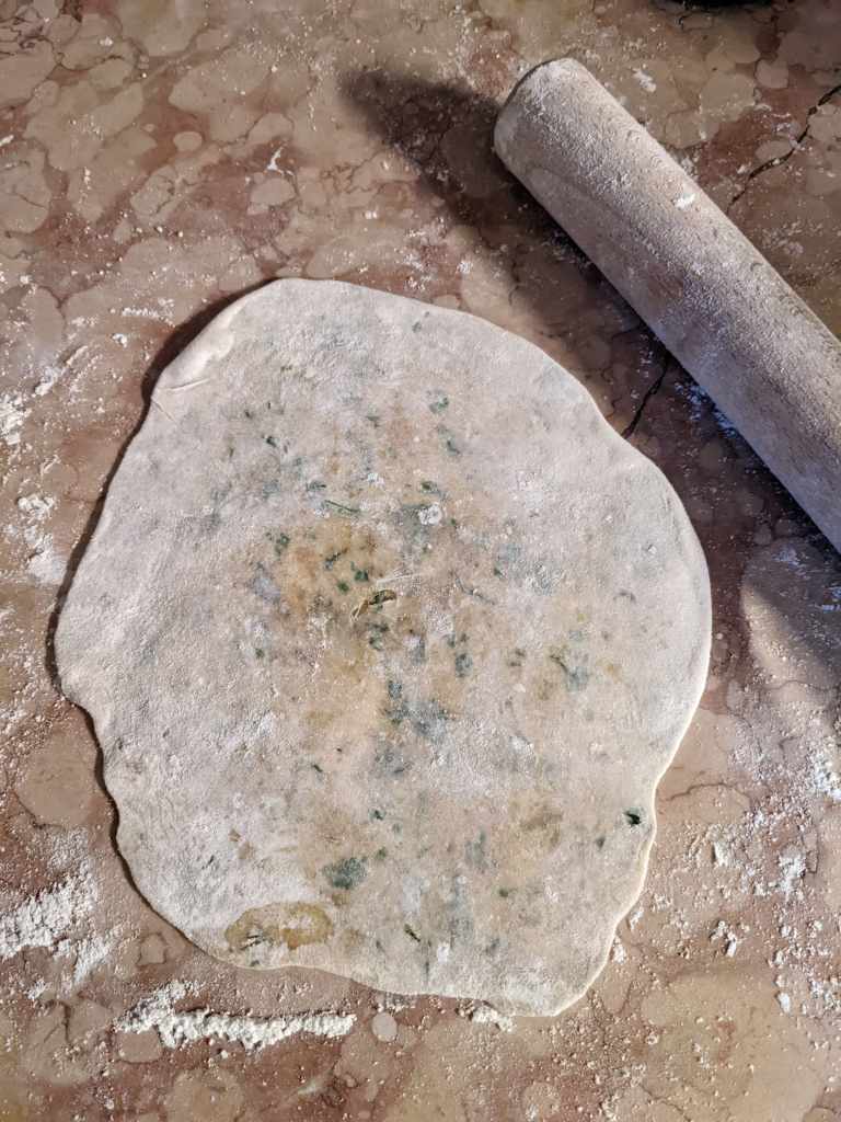 Dip the filled ball in flour and then flatten it gently. Start rolling it out with caution, and not much pressure, turning it round to spread the potato out.