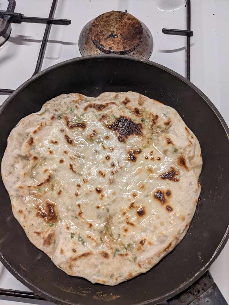 Heat a pan to very hot. Once the pan is hot add a paratha – after 2-3 minutes, once bubbles have appeared, flip the paratha. Then drizzle ghee or vegetable oil over the bread and flip again.