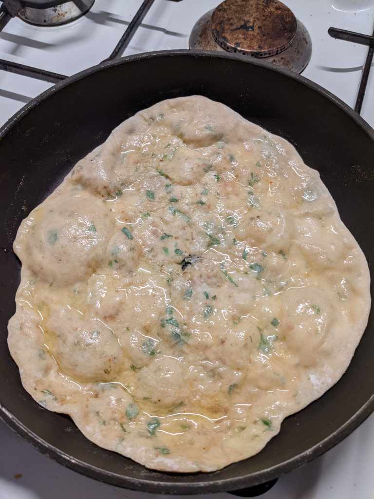 Add more ghee and press the paratha down so it cooks.