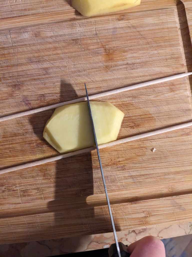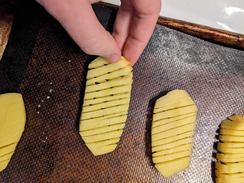 Place each slice in between to wooden skewers and cut in a straight line, then flip the slice over and cut on the diagonal. Each slice should then look like a little concertina, pretend to play it while wistfully looking out a window like Steve Martin in “Only Murders in the Building”.