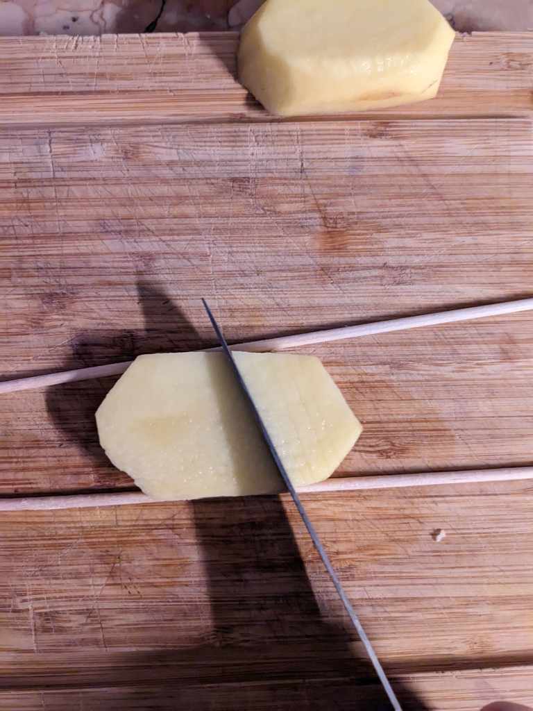 Peel those tatties (no that is not a chat up line) and cut them into slices a couple of centimetres thick.