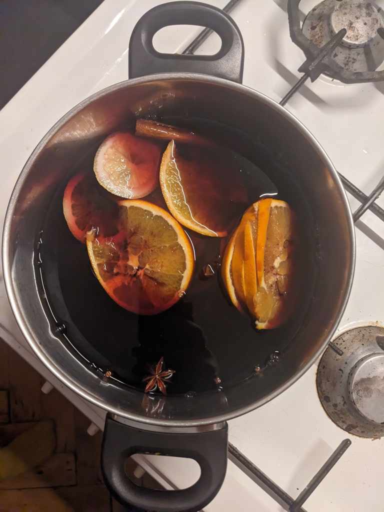 Close your eyes and imagine you’re in the medieval kitchen of a Robin Hobb novel to get into the correct headspace, before opening your eyes again to avoid kitchen accidents, slicing the lemon and orange and adding them to a saucepan along with all the spices (1 small stick of cinnamon,3 cloves, 1 star anise) and the 1 litre of red wine.