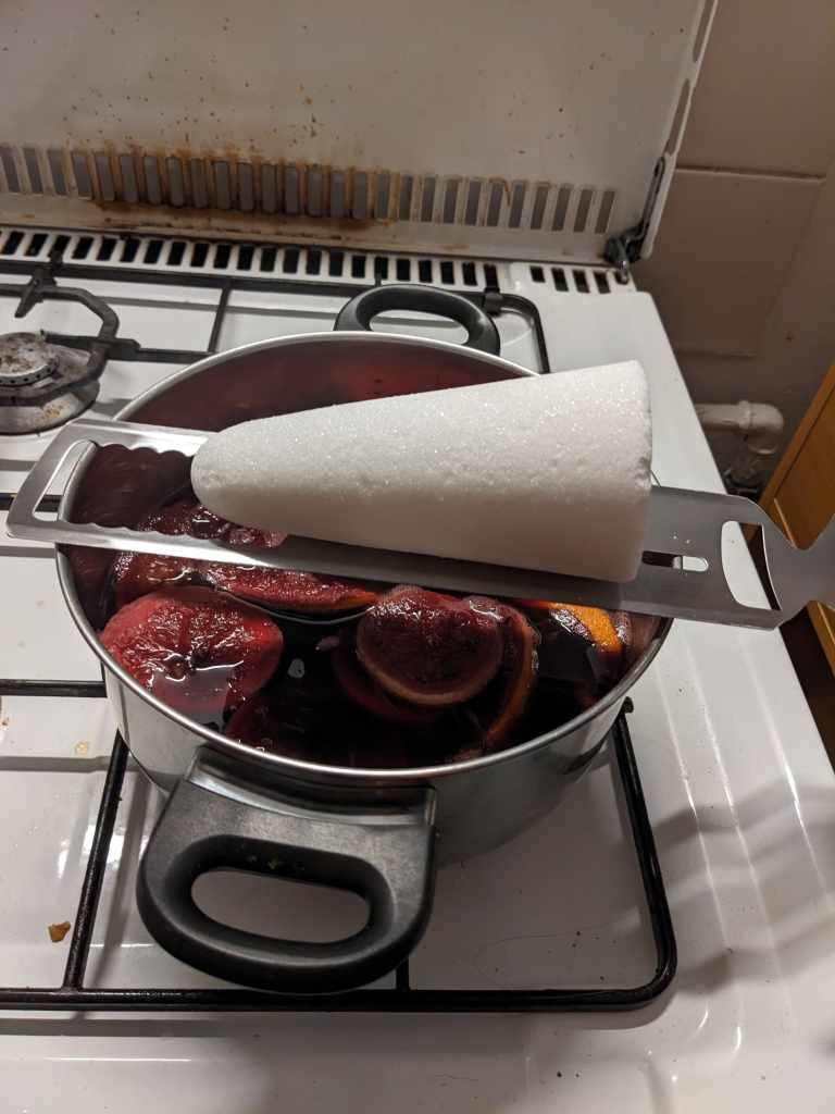 1 sugar cone (NB: The full recipe with two litres of wine uses a full cone, but it seems sugar cones are only available in one size. Once it’s melted about halfway and is safe to remove that should be enough)